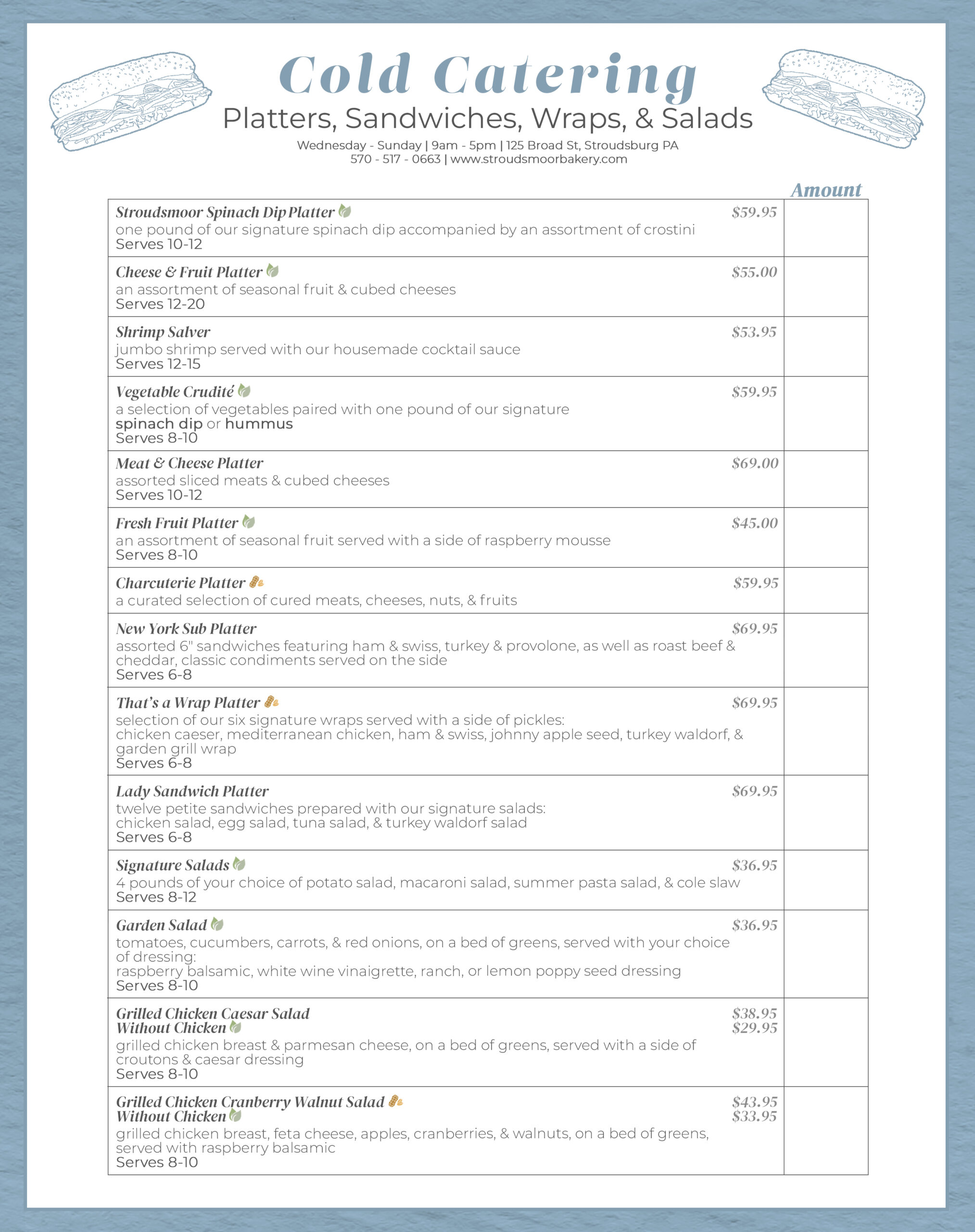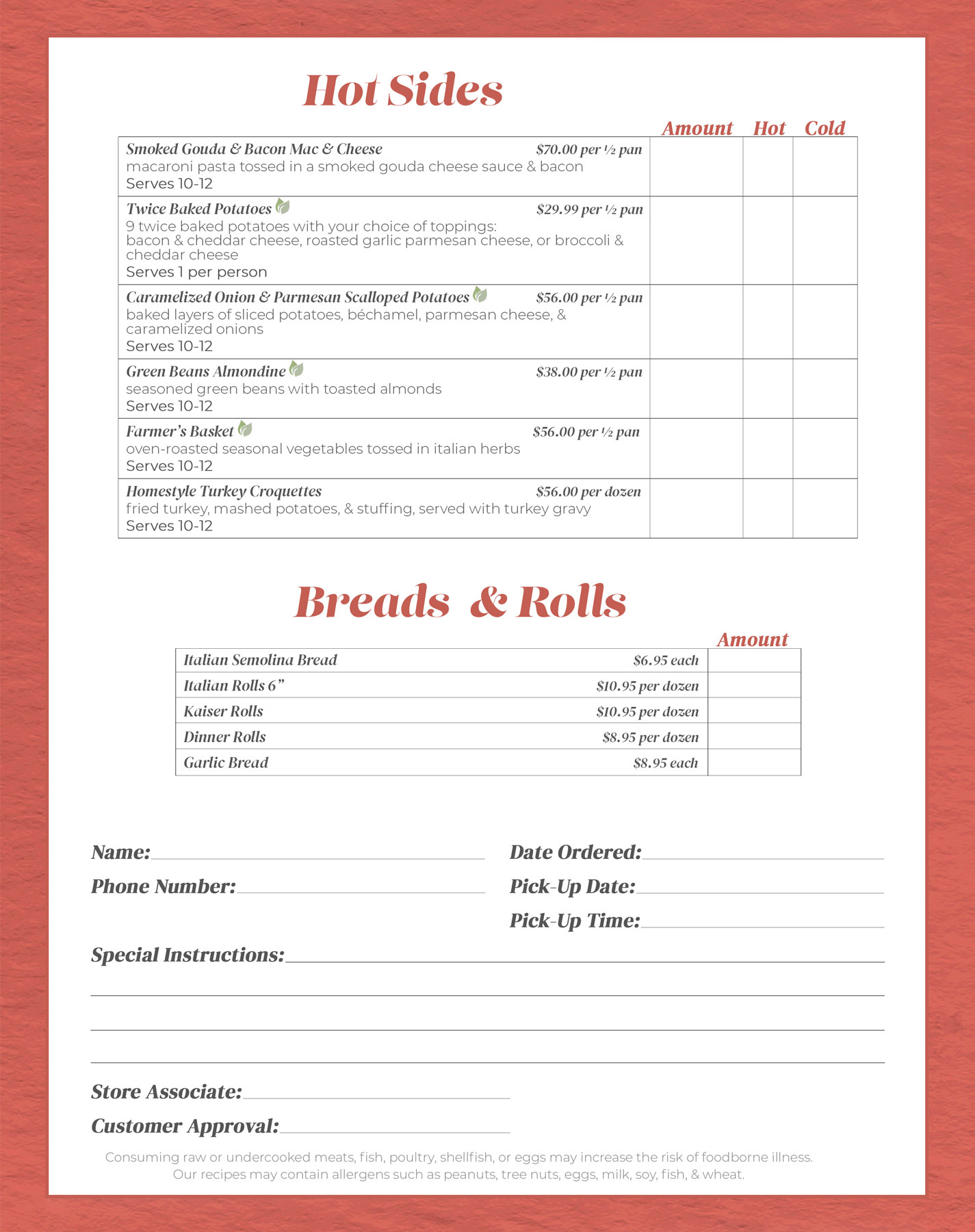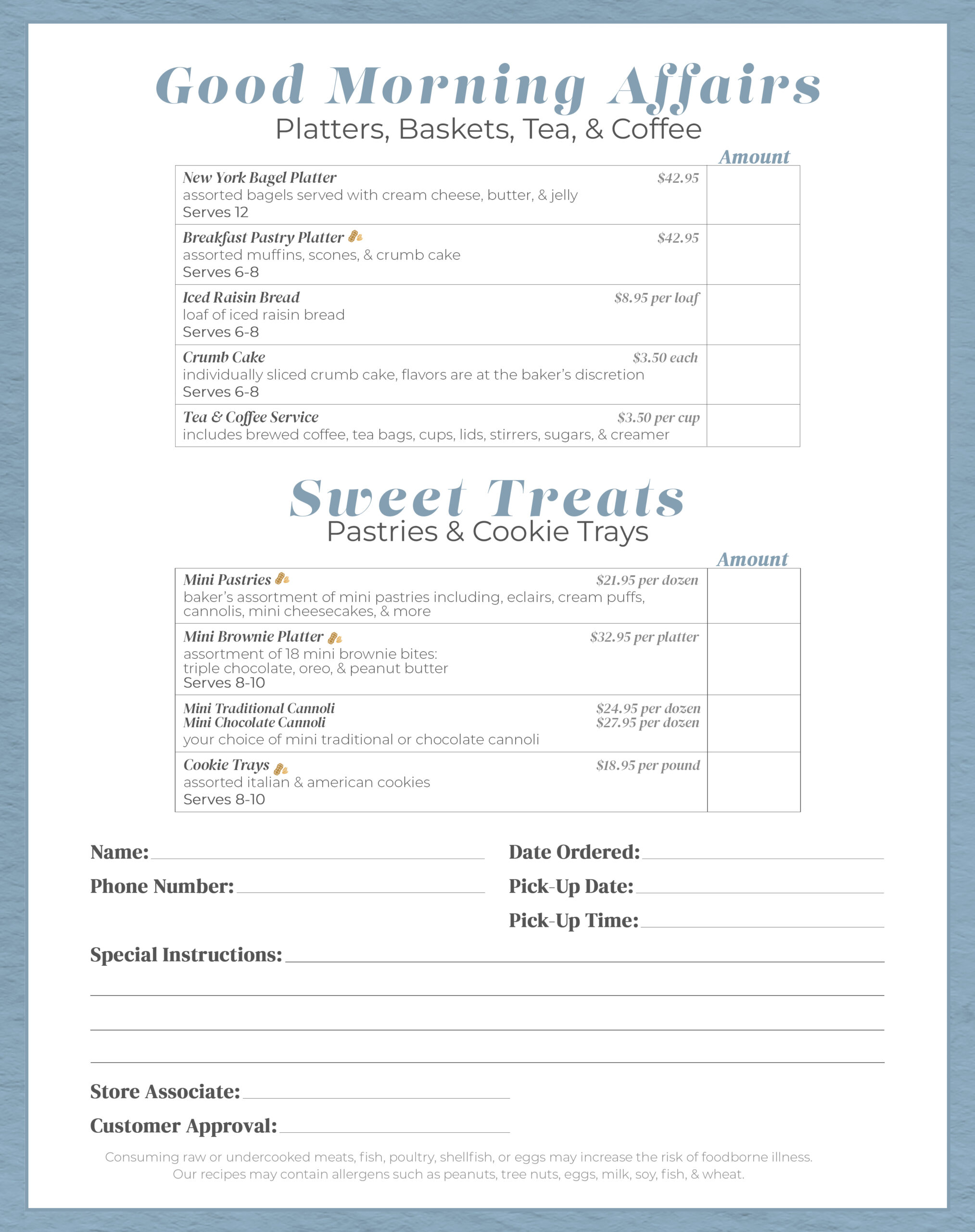 Seeking a standout meal for your next gathering? Inquire about our catering options, customized entrees, and baskets. Add cake or pastries to sweeten your event! Catering Orders require full payment upon ordering, non-refundable.