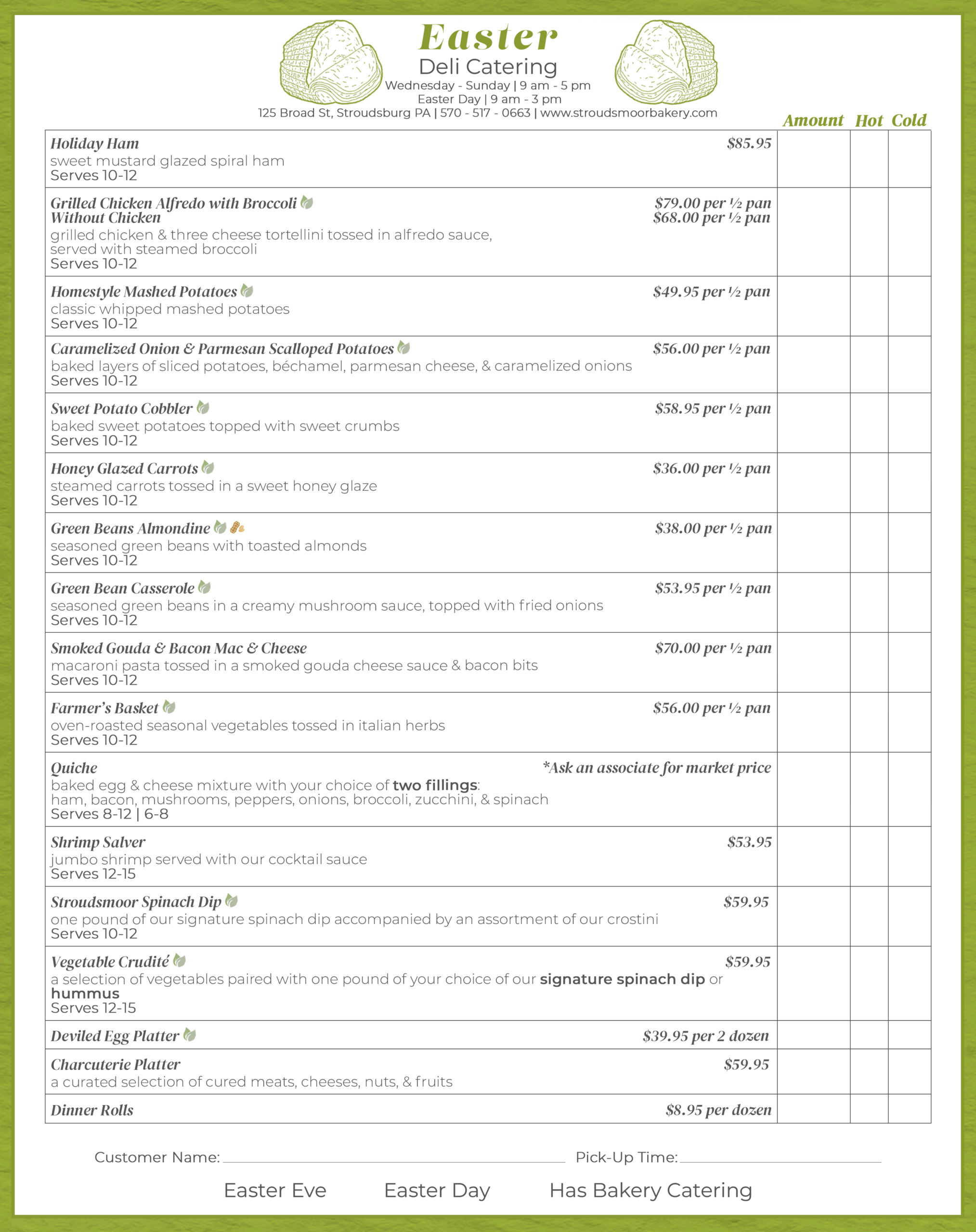 Simply fill out our easy order forms to choose your Easter favorites, note any dietary preferences, and select your pick-up date and time. Whether you stop by in person or call from home, we’re here to make your Easter gathering smooth, flavorful, and effortlessly special.